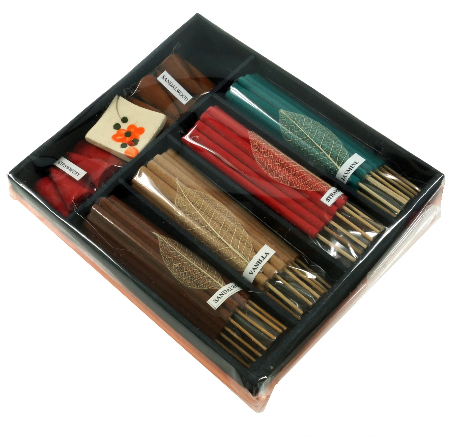 Buntes Geschenkset bestehend aus einem Keramik-Räucherstäbchenhalter und einer bunten Mischung wohlriechender Räucherstäbchen.