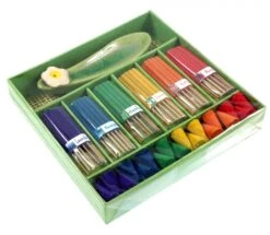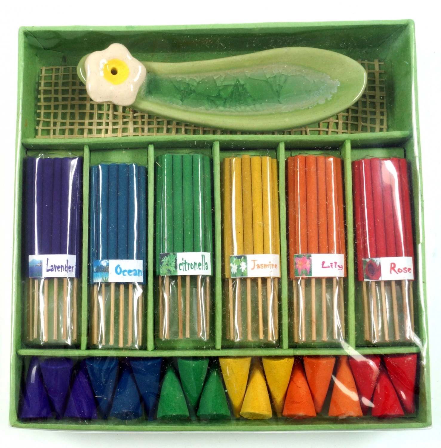 Buntes Geschenkset bestehend aus einem Keramik-Räucherstäbchenhalter, sechs verschiedenen Sorten Räucherstäbchen und Räucherkegel in einer dekorativen Verpackung.