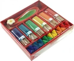 Buntes Geschenkset bestehend aus einem Keramik-Räucherstäbchenhalter, sechs verschiedenen Sorten Räucherstäbchen und Räucherkegel in einer dekorativen Verpackung.