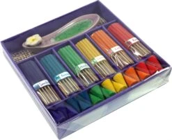 Buntes Geschenkset bestehend aus einem Keramik-Räucherstäbchenhalter, sechs verschiedenen Sorten Räucherstäbchen und Räucherkegel in einer dekorativen Verpackung.