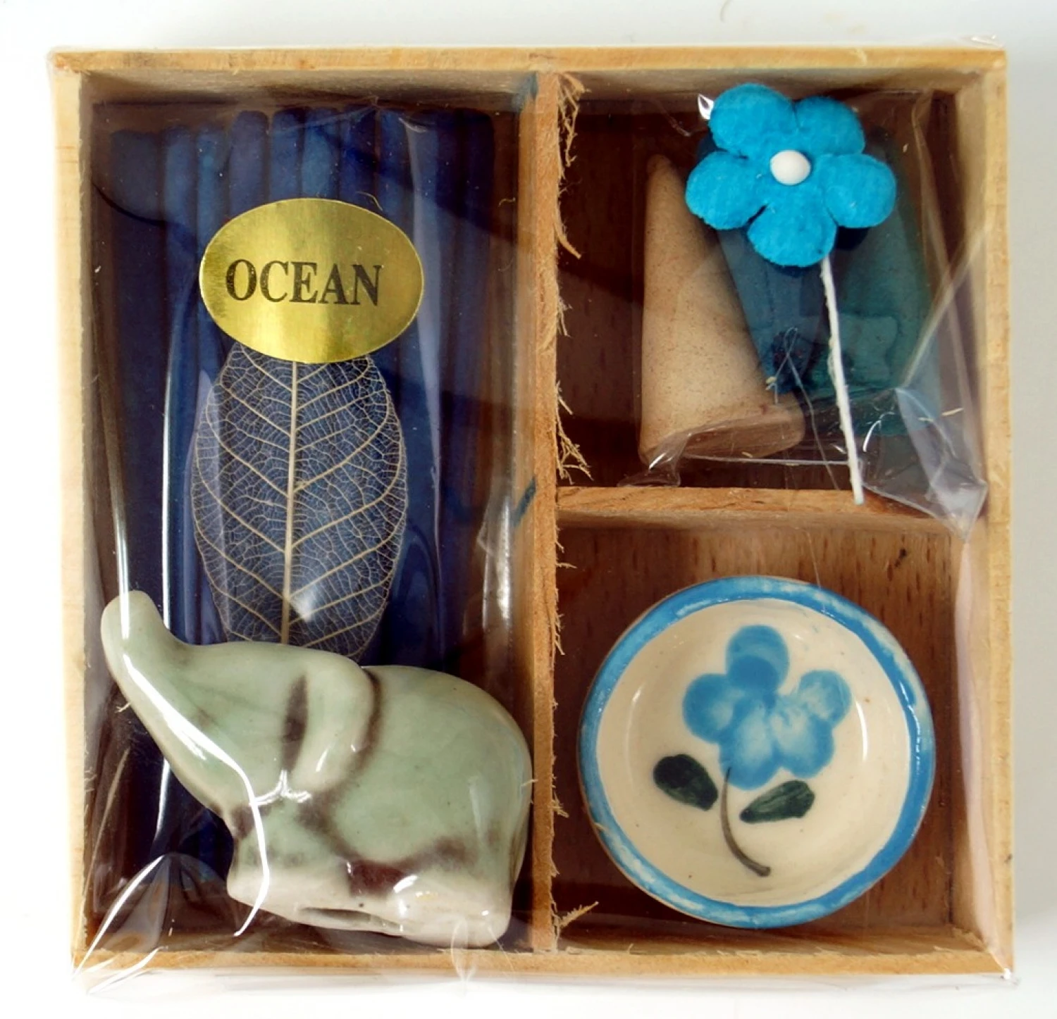 Das Räucherset besteht aus einer kleinen Holzbox, einem Räucherstäbchenhalter in Form eines kleinen Elefanten, einer Sorte Räucherstäbchen, drei verschiedenen Räucherkegeln und einem kleinen Keramikuntersetzer zum Abbrennen der Räucherkerzen. Dieses schöne Räucherwerk verzaubert jedes Ambiente mit seinen exotischen Düften.