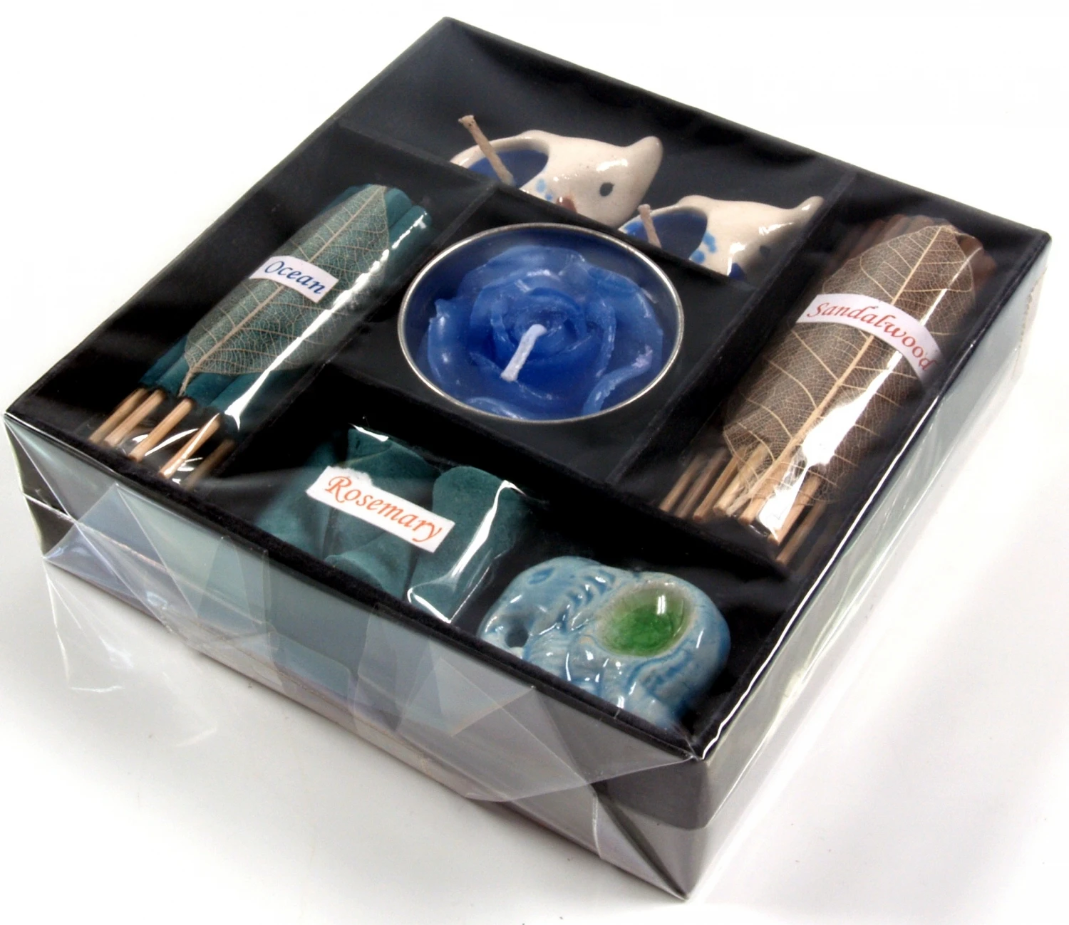 Buntes Geschenkset bestehend aus einem Keramik-Räucherstäbchenhalter, drei Dekokerzen, zwei kleinen Bündeln Räucherstäbchen und einem Päckchen Räucherkegel inklusive Halter.