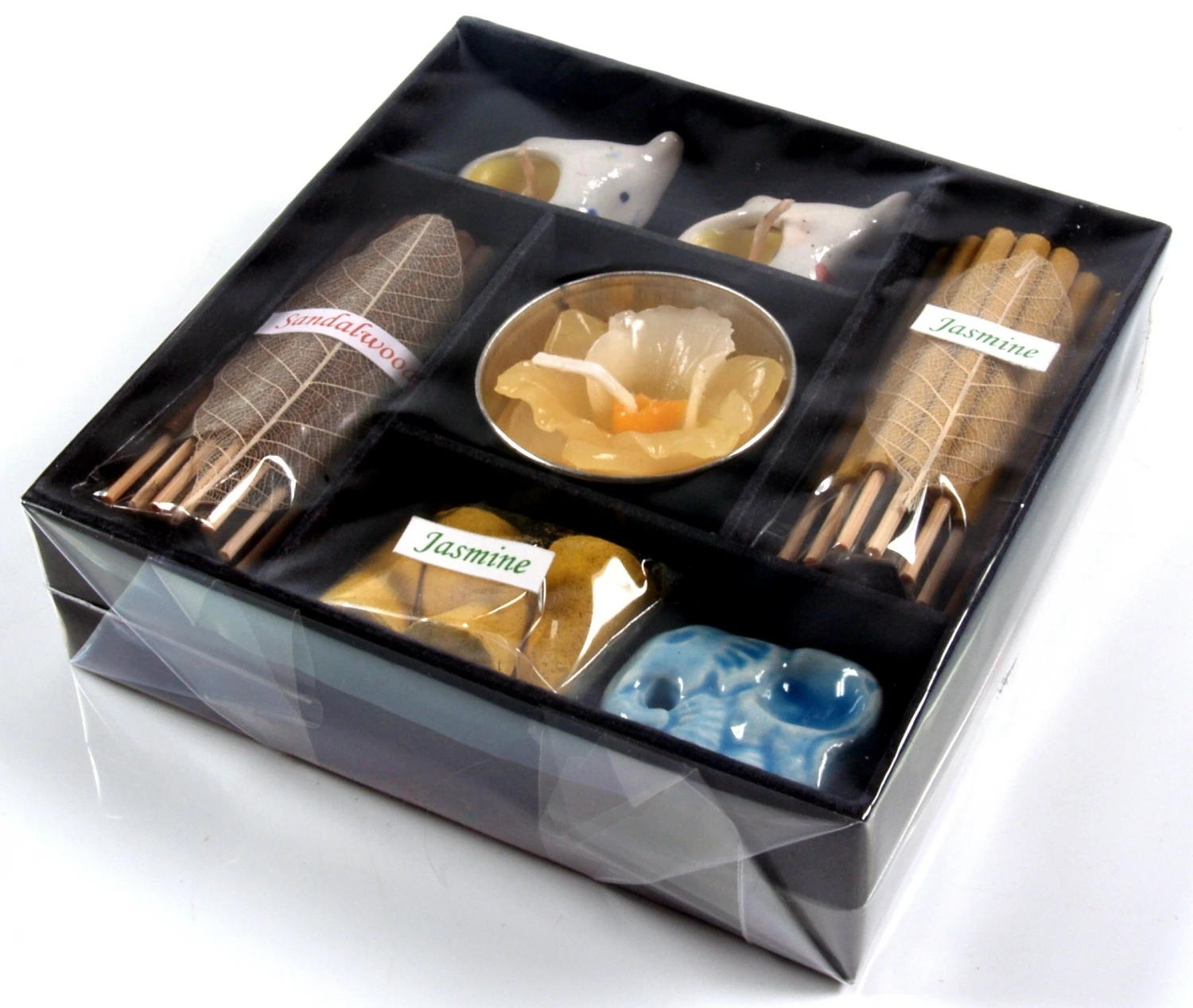 Buntes Geschenkset bestehend aus einem Keramik-Räucherstäbchenhalter, drei Dekokerzen, zwei kleinen Bündeln Räucherstäbchen und einem Päckchen Räucherkegel inklusive Halter.