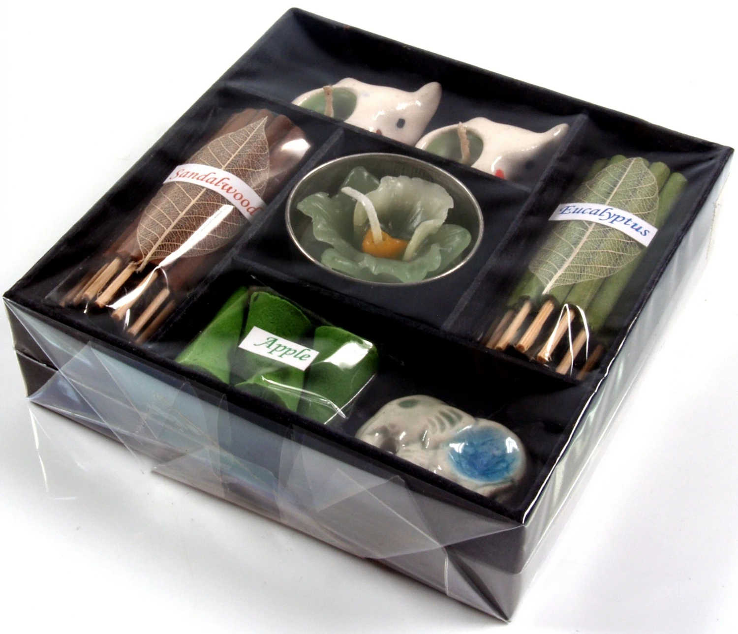 Buntes Geschenkset bestehend aus einem Keramik-Räucherstäbchenhalter, drei Dekokerzen, zwei kleinen Bündeln Räucherstäbchen und einem Päckchen Räucherkegel inklusive Halter.