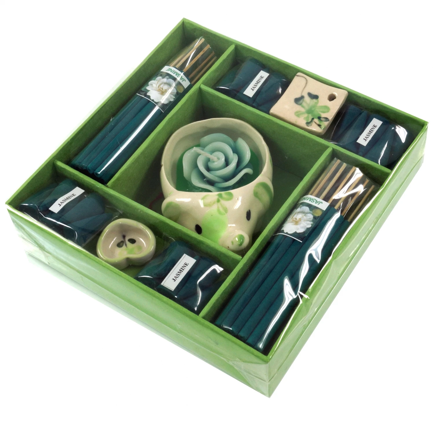 Buntes Geschenkset bestehend aus einem Keramik-Räucherstäbchenhalter, einer Dekokerze im Keramikelefant, zwei kleine Bündeln Räucherstäbchen und vier Päckchen Räucherkegel inklusive Halter in dekorativer Geschenkbox.
