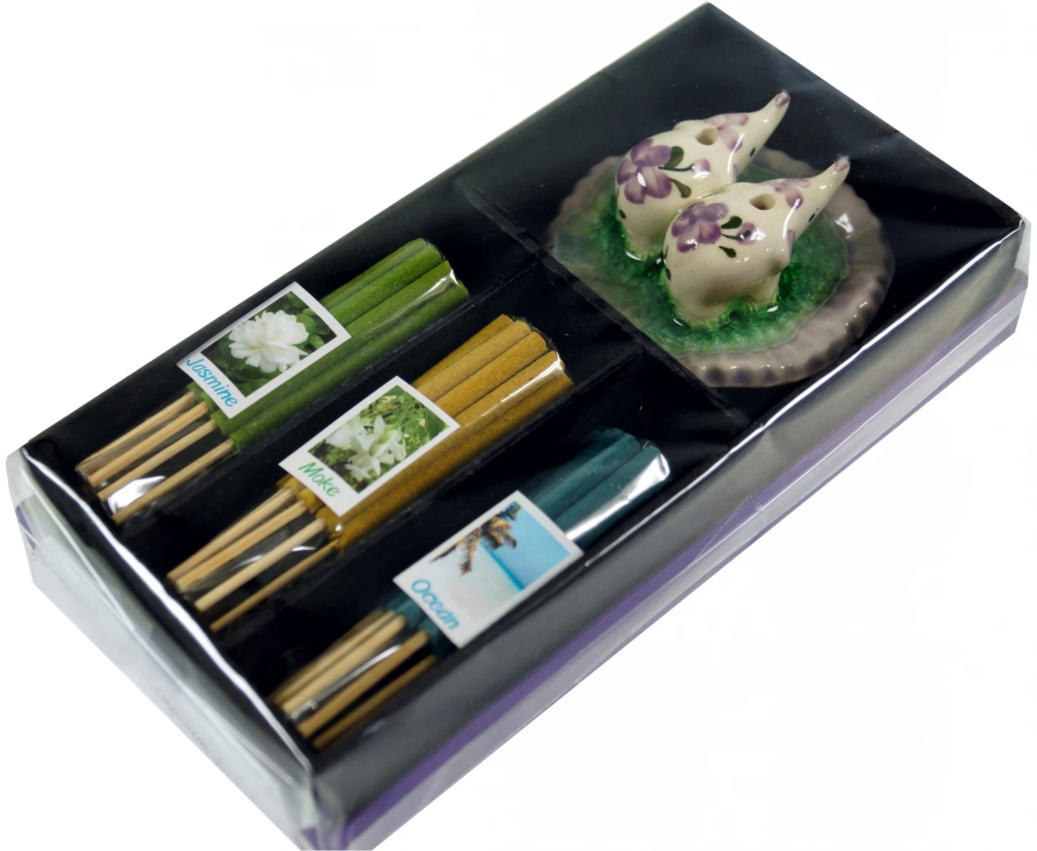 Wunderschönes Räucherset, bestehend aus drei Düften und einem Keramikhalter mit kleinen Elefantenfiguren als Glücksbringer. Die Räucherstäbchen verzaubern jedes Ambiente mit ihren tropischen Düften.