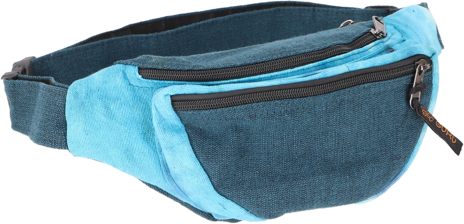 Praktische Gürteltasche aus Nepal. Der helle Teil ist leicht gebatikt. Die Tasche hat drei geräumige Fächer mit Reißverschluss. Die farblich abgestimmten Stoffteile geben dieser Tasche ihren ganz individuellen Ethno-Touch. Der Gurt ist von 85 cm bis 110 verstellbar.