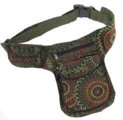 Gürteltasche aus Stoff mit drei Reißverschlusstaschen, davon eine in der Innenseite des Gurtes. Eine weitere kleine Tasche mit Klettverschluss befindet sich auf der Vorderseite des Gurtes. Der dezente Mandaladruck ist mit kontrastreichen Stickereien hervorgehoben. Jede Tasche wurde in Nepal von Hand gefertigt.