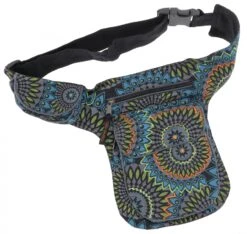 Gürteltasche aus Stoff mit drei Reißverschlusstaschen, davon eine in der Innenseite des Gurtes. Eine weitere kleine Tasche mit Klettverschluss befindet sich auf der Vorderseite des Gurtes. Der dezente Mandaladruck ist mit kontrastreichen Stickereien hervorgehoben. Jede Tasche wurde in Nepal von Hand gefertigt.