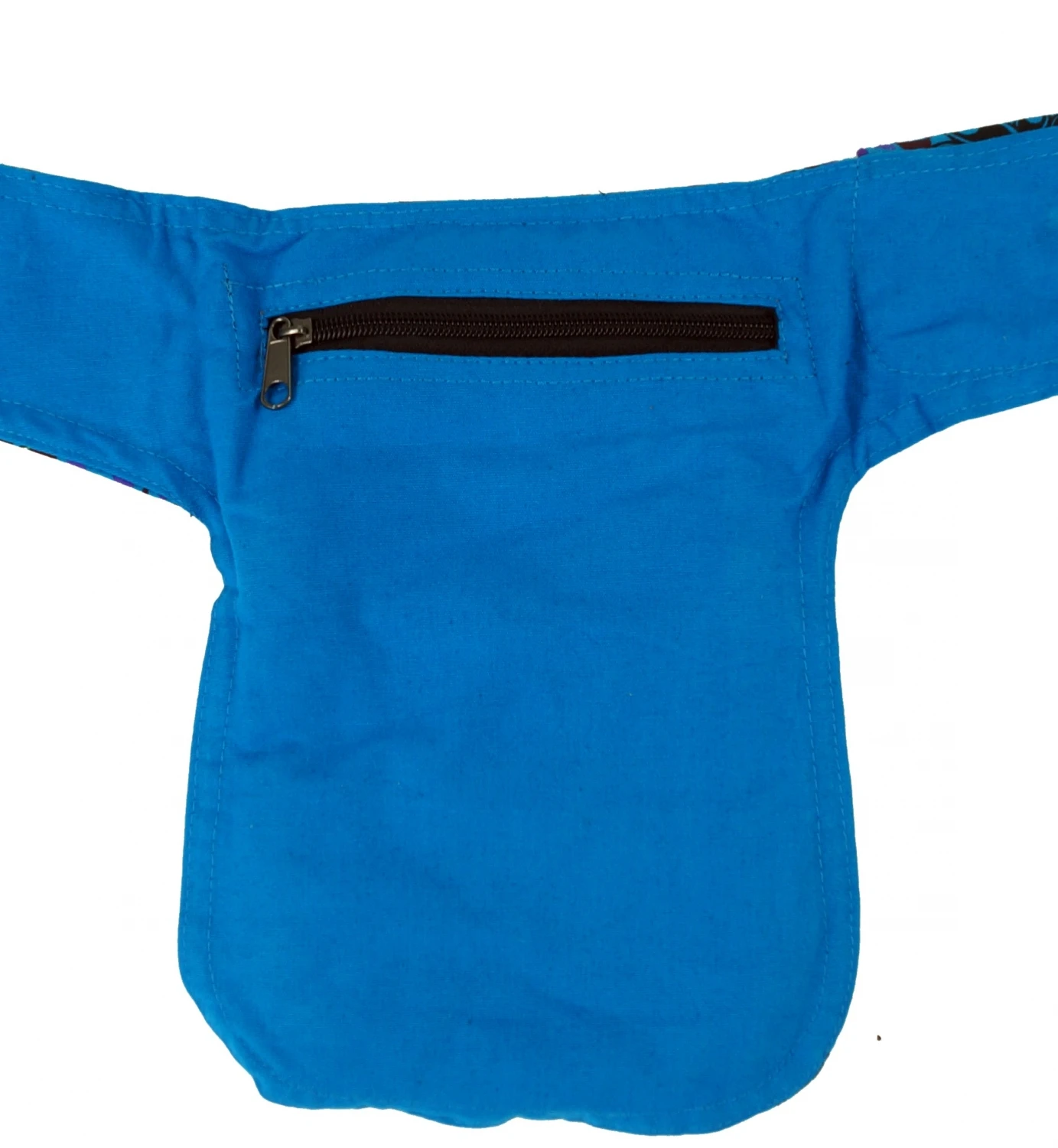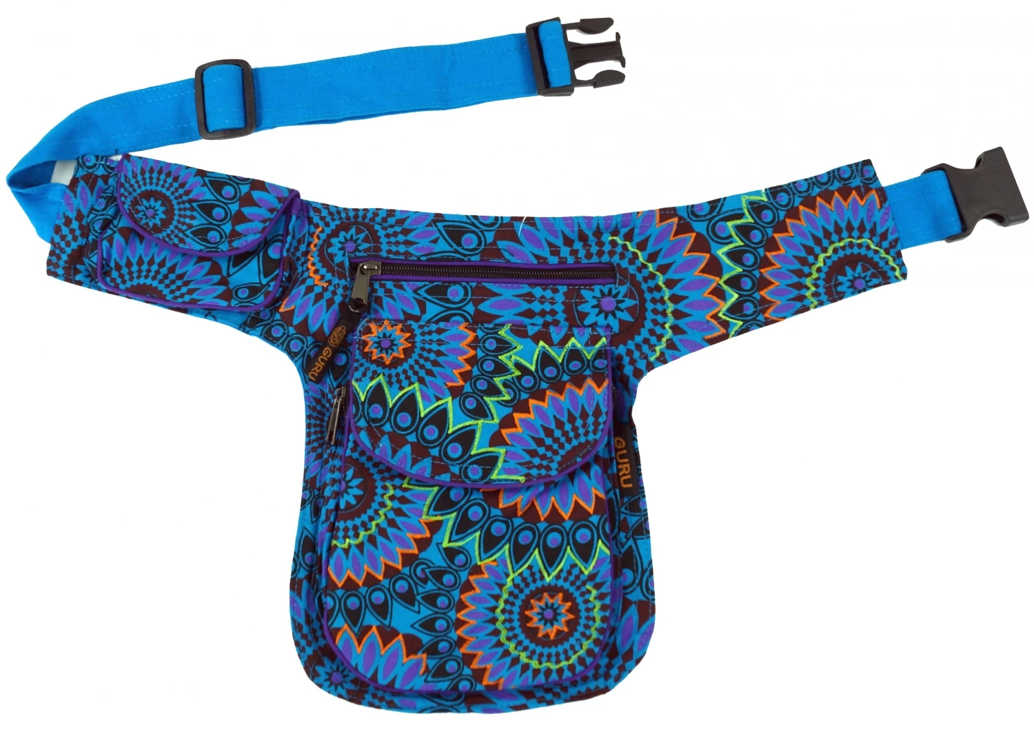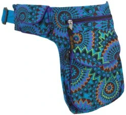 Gürteltasche aus Stoff mit drei Reißverschlusstaschen, davon eine in der Innenseite des Gurtes. Eine weitere kleine Tasche mit Klettverschluss befindet sich auf der Vorderseite des Gurtes. Der dezente Mandaladruck ist mit kontrastreichen Stickereien hervorgehoben. Jede Tasche wurde in Nepal von Hand gefertigt.
