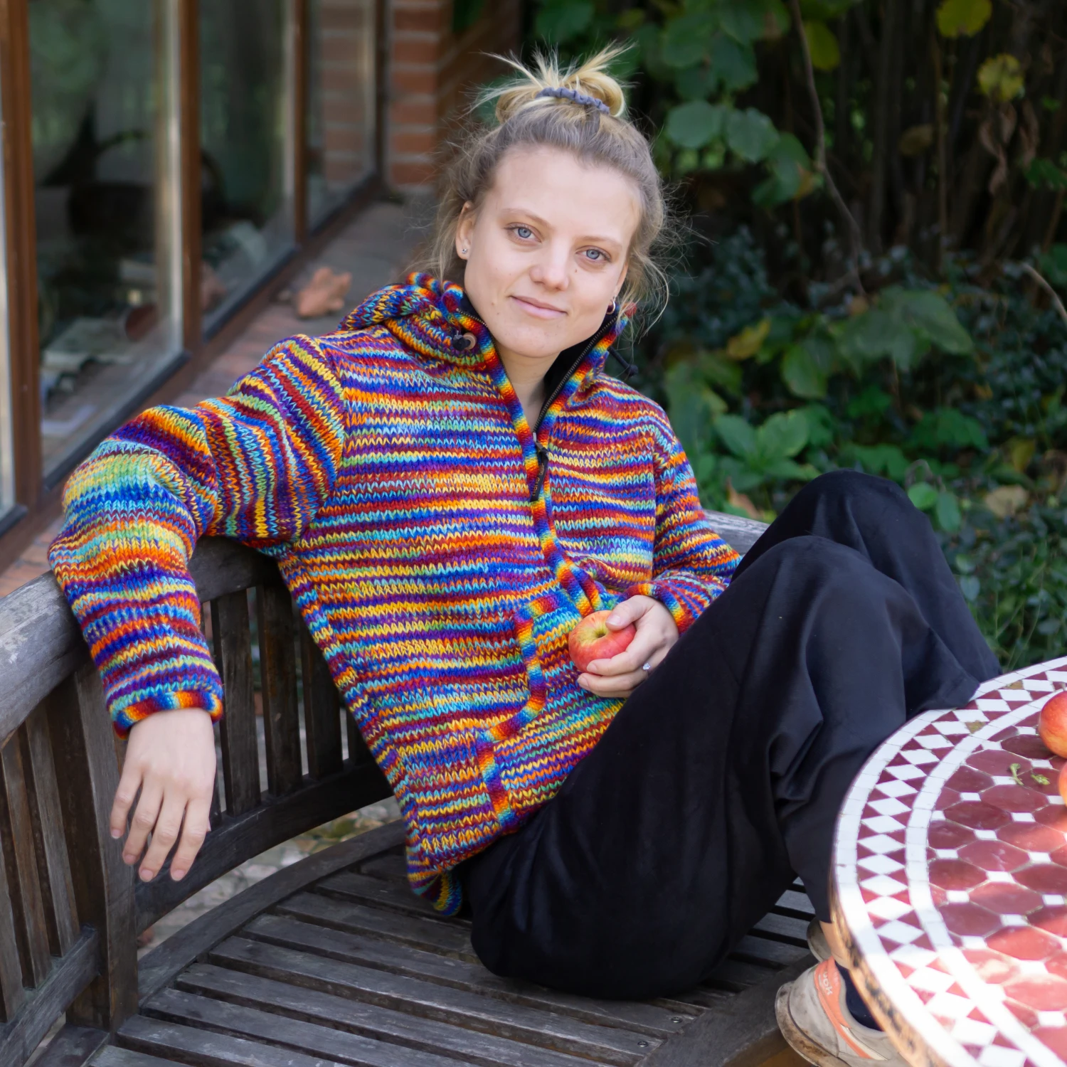 Fleece gefütterte Unisex Strickjacke aus reiner Schafwolle. Mollig warm mit geräumigen Taschen. Eine treue Begleiterin an eisigen Tagen. Die Strickjacke hat eine Innentasche.