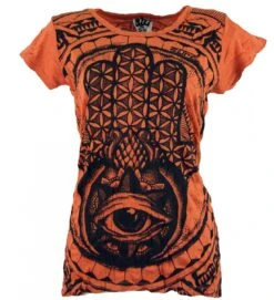 Trendiges T-Shirt mit qualitativ hochwertigem Druck in leichtem `Krinkel-Look`, der Kragen hat einen angesagten `Used-Look`. Der Aufdruck vereint Fatimas Hand, die Blume des Lebens und das schützende Dritte Auge.Um den Krinkeleffekt auch nach dem Waschen zu bewahren, bitte nach dem Waschen einfach zusammen drehen. Das Material ist weich und sehr angenehm zu tragen.