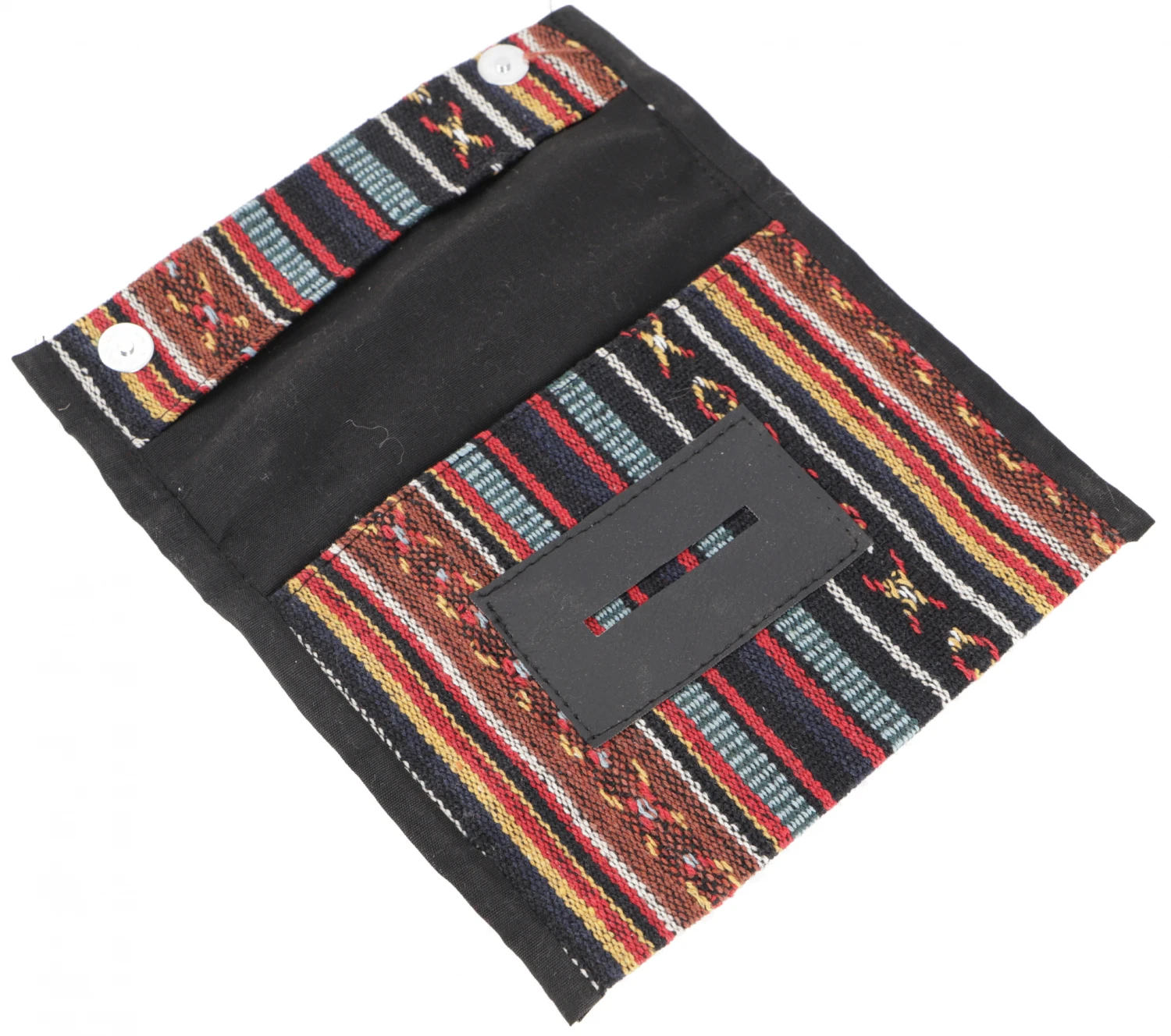 Tabakbeutel aus traditionellem Webstoff aus Nepal mit Magnetdruckknöpfen. Tabak, Papers ect. bleiben so schön geordnet und sind immer griffbereit. Auf der Rückseite gibt es eine zusätzliche Reißverschlusstasche für kleine Extras.