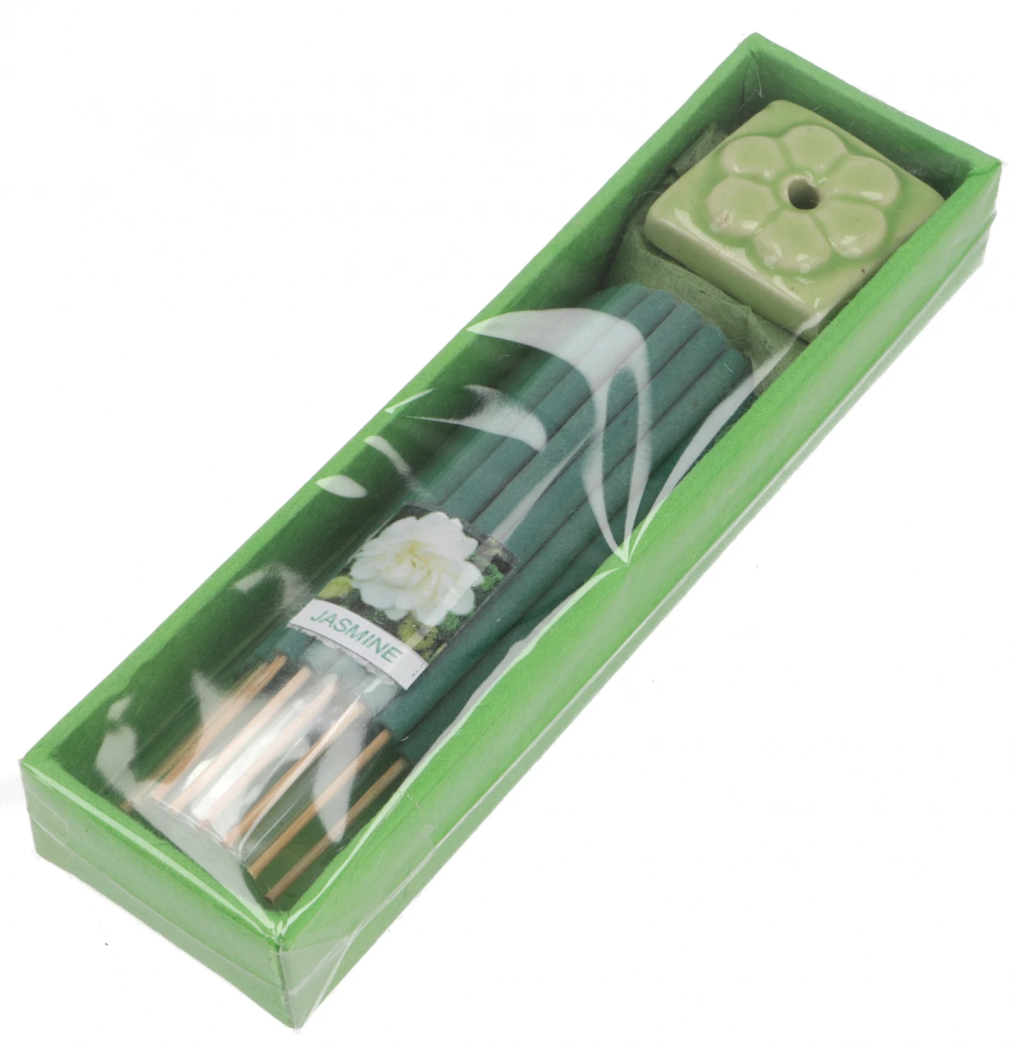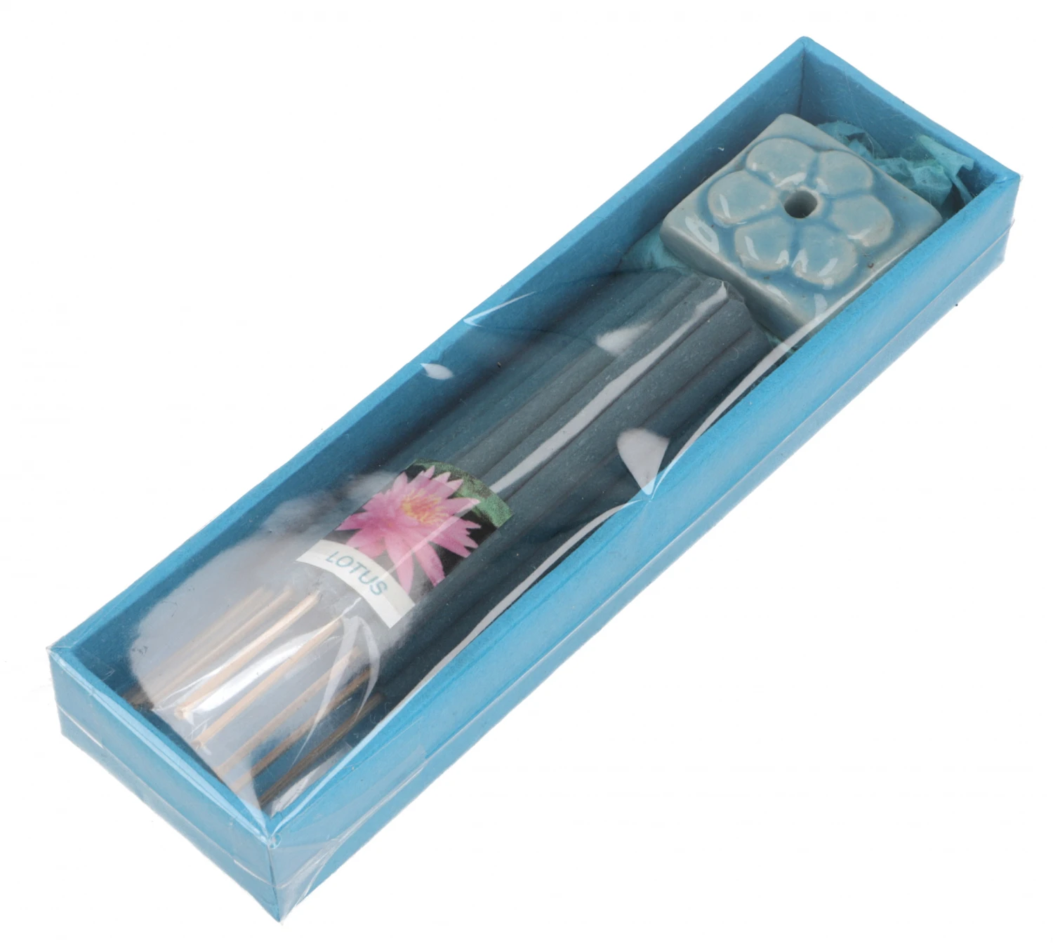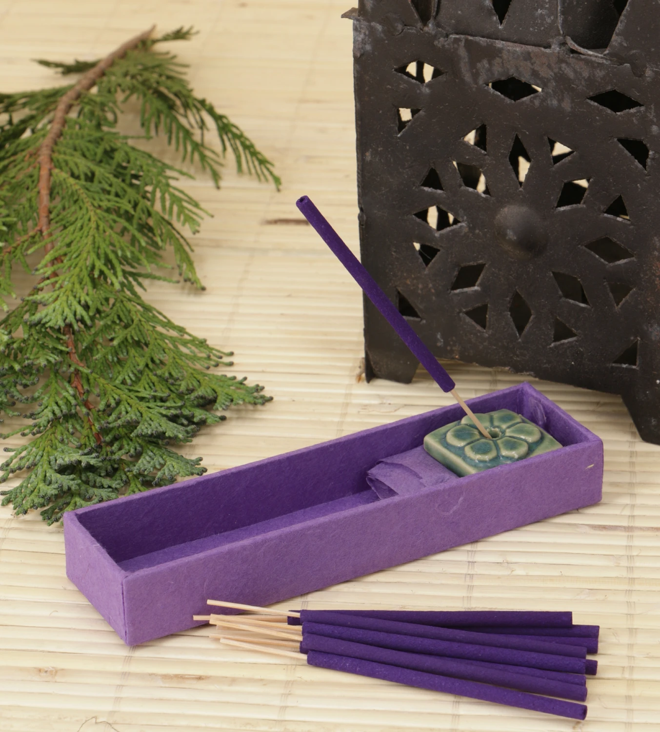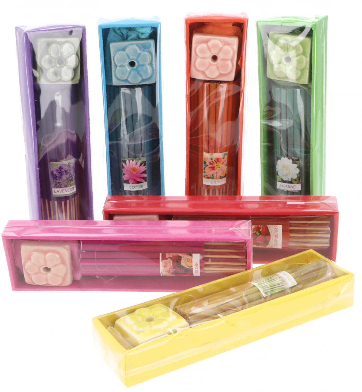 Farbiges Geschenkset bestehend, aus einem kleinen Keramik Räucherstäbchenhalter und ca. 10 Räucherstäbchen. Stellt man den kleinen Halter in die handgefertigte Papierschachtel kann die Asche darin aufgefangen werden. Ein hübsches Mitbringsel für Liebhaber*innen von Räucherwerk.