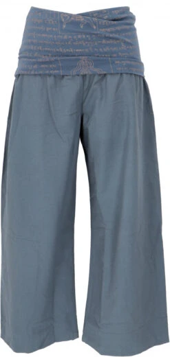 Hose aus Baumwolle mit überbreitem bedrucktem Bund, der beliebig weit nach unten gefaltet werden kann.