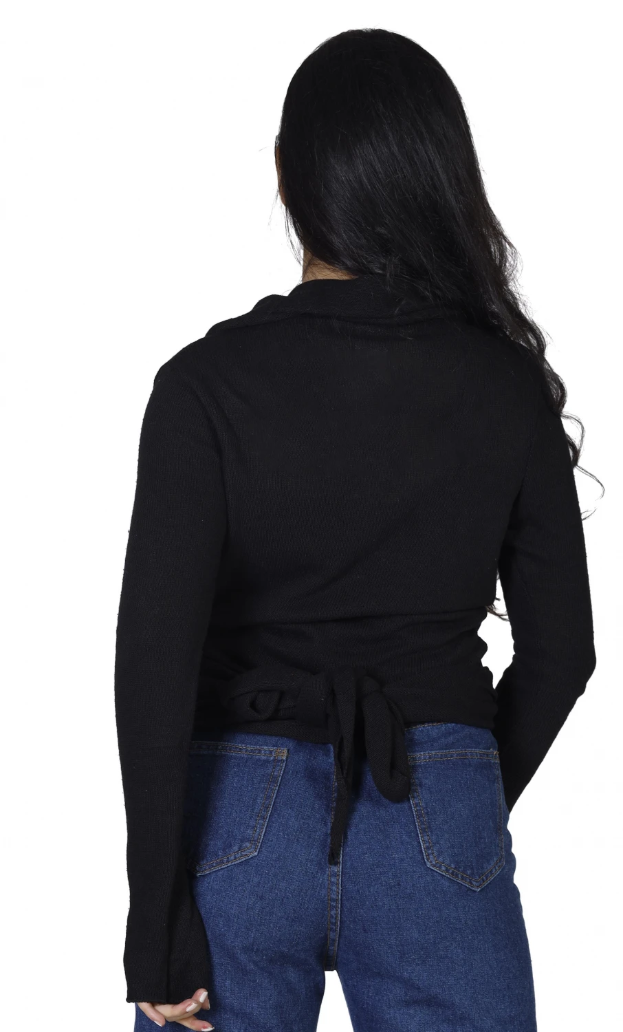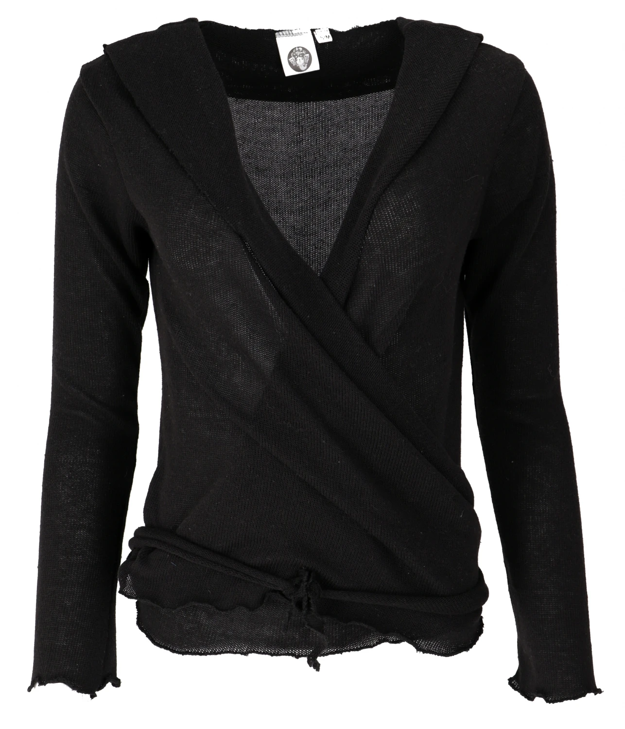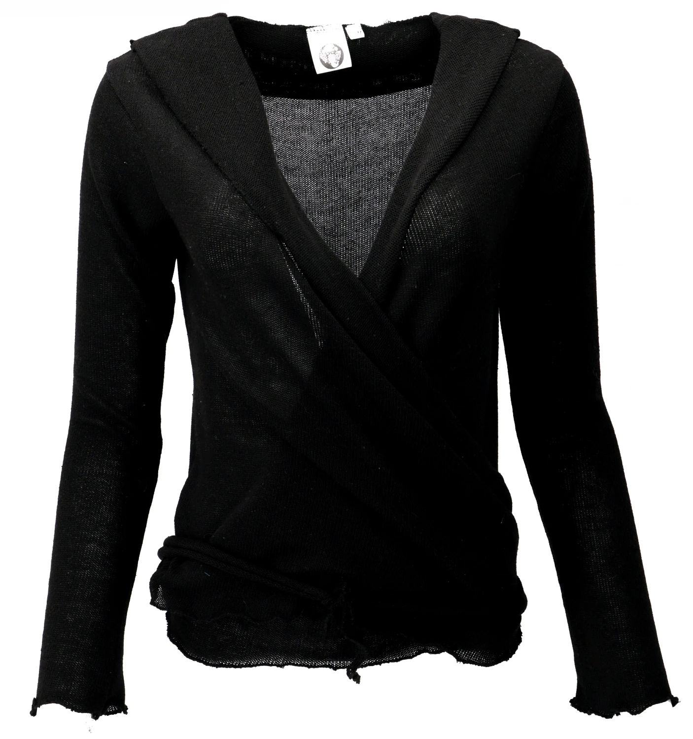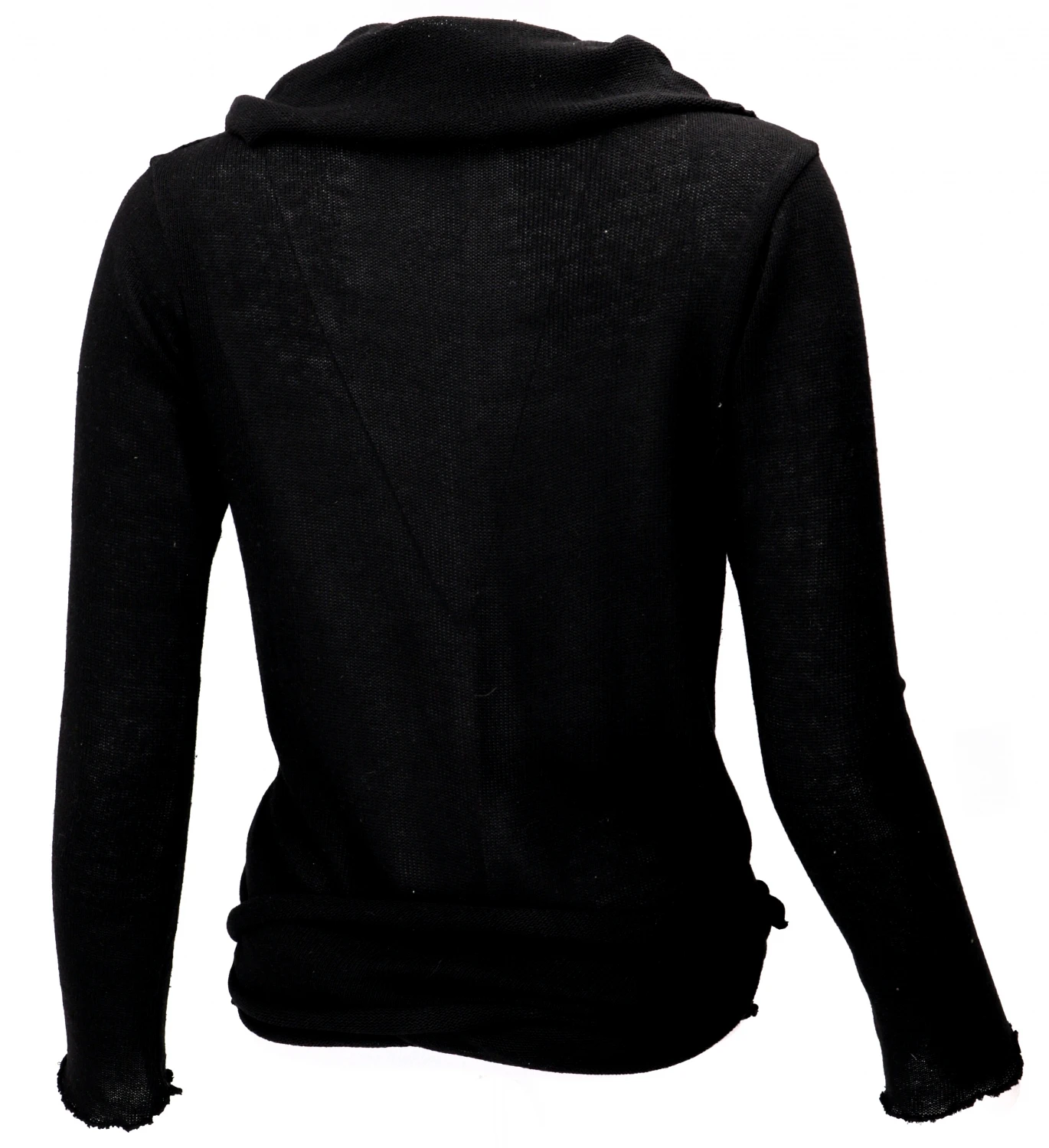 Figurbetontes Strickshirt zum Wickeln. Je nach Belieben kann man das Shirt aus weichem, natürlichen Baumwollstrick vorn, hinten oder seitlich binden.